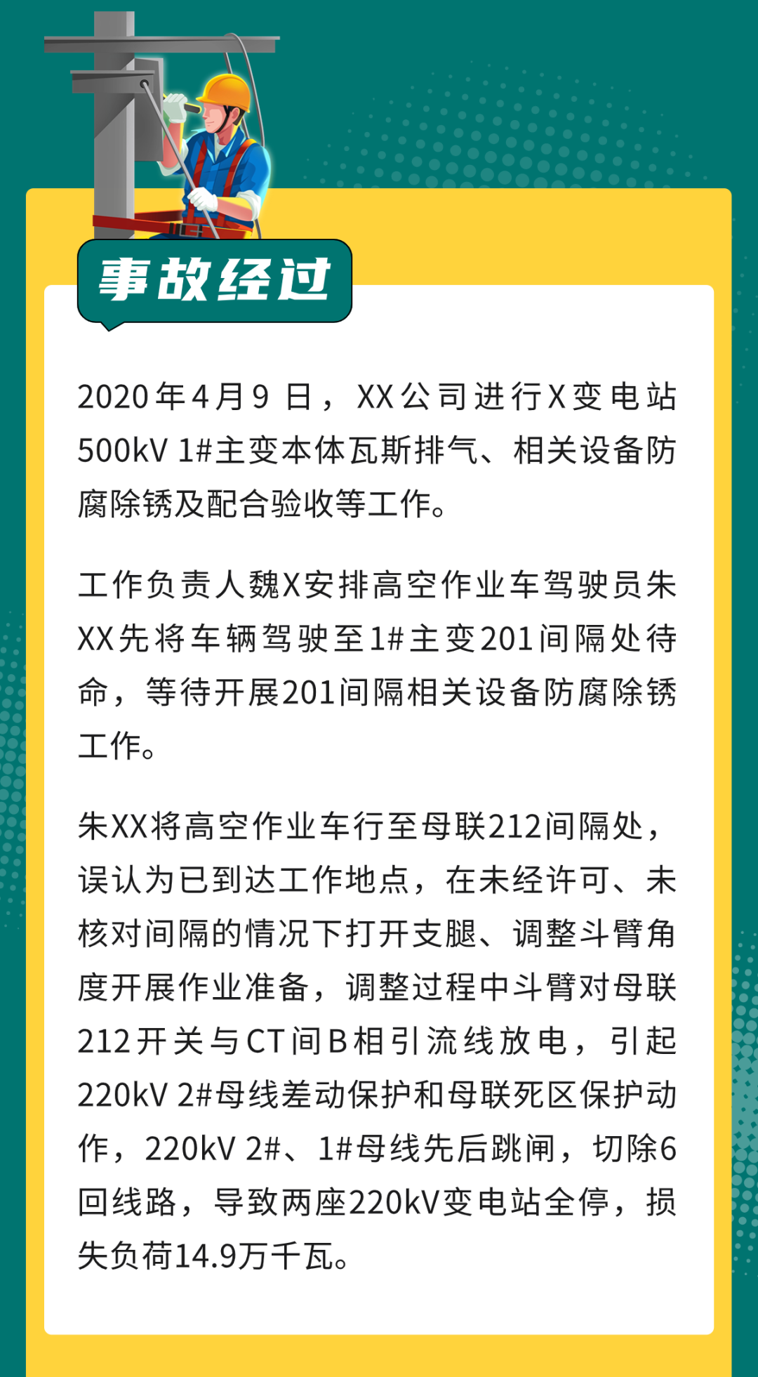 2020年4月9日,某公司在 500kV 一變電站檢修期間高空作業(yè)車斗臂與帶電設(shè)備安全距離不足放電,導(dǎo)致 220kV 1#、2# 母線停運,損失負(fù)荷 14.9 萬 kW。