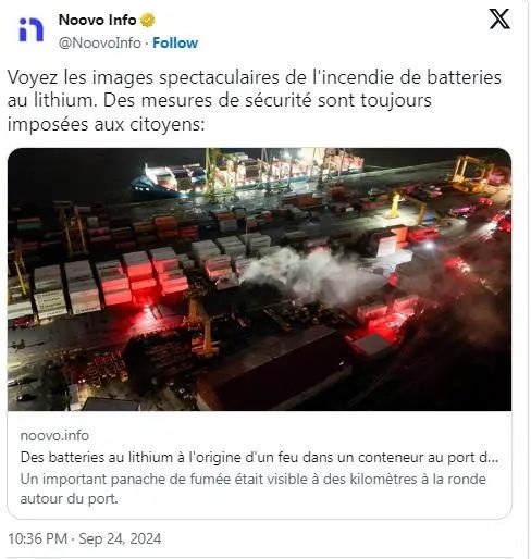 據(jù)外媒的報道稱,當?shù)貢r間 9 月 23 日(星期一)下午 3 點 15 分左右,加拿大蒙特利爾港碼頭(Montreal)上一裝有 15 噸 鋰離子電池 的集裝箱著火。