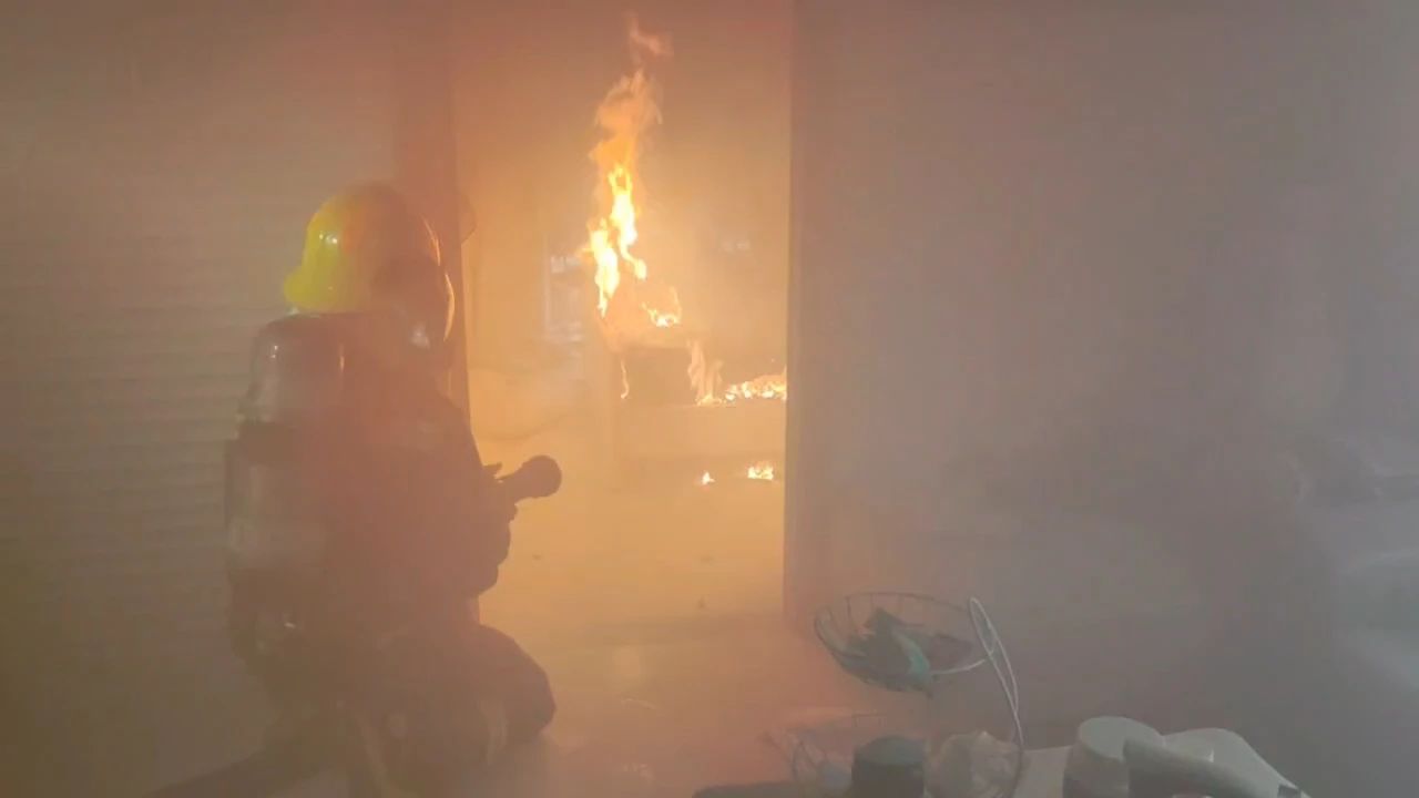 使用水槍對(duì)屋內(nèi)明火進(jìn)行撲滅